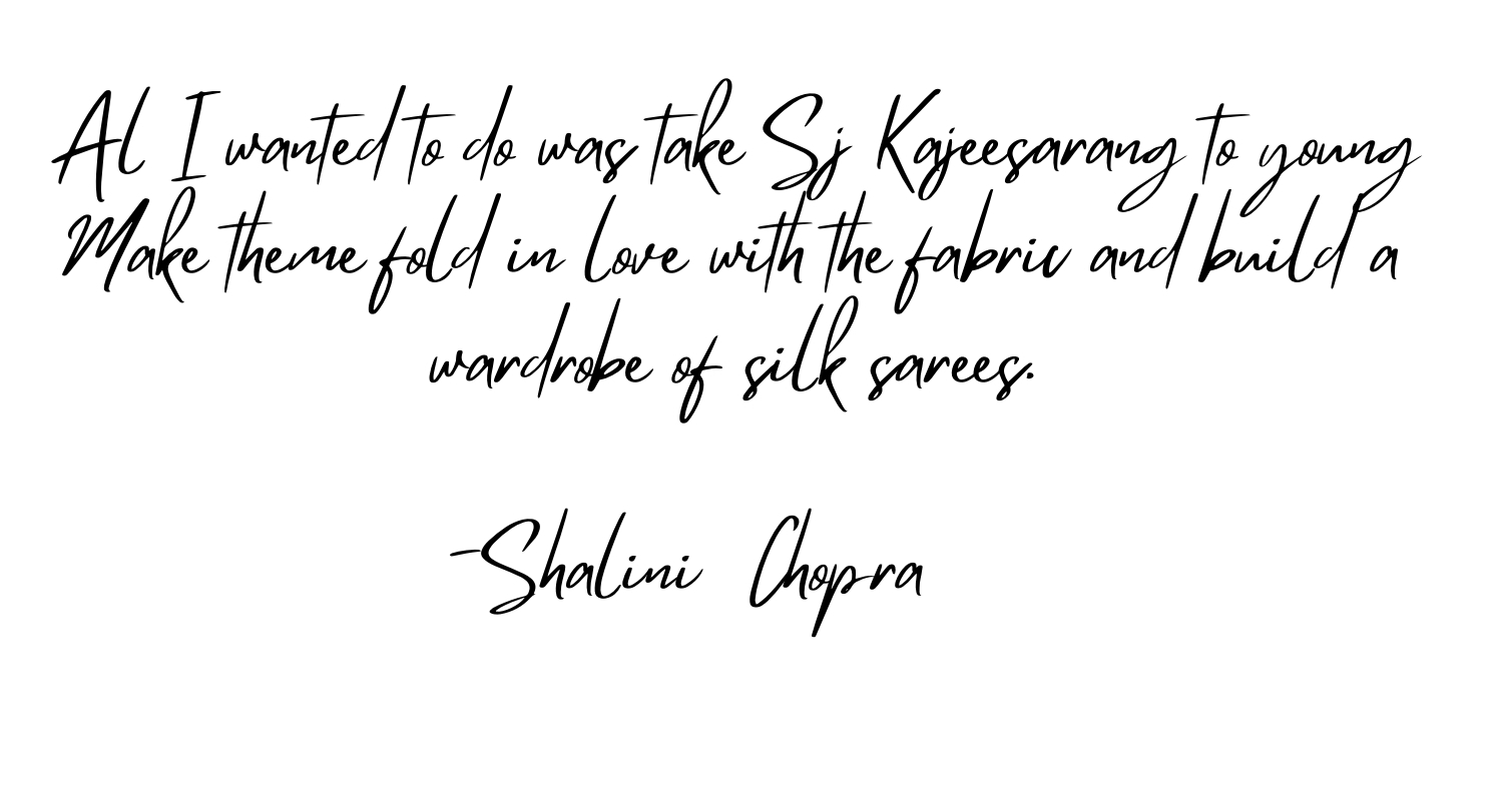 Mrs. Shalini Chopra started four lines of SJ Silks – Casual Silks, Designer Silks, Bridal Silks, and Concept Silks. This shook the industry as a whole as SJ Silks were revered as the most premium silk of India. Mrs. Shalini preserved the sanctity of the fabric and experimented only in designs and colours. However, over time she realized that young women found it difficult to wear Kanjeevaram Silks frequently. since silk sarees carry a certain amount of weight. Mrs. Shalini worked with her master weaver over a year to change the texture of silk without compromising on quality.