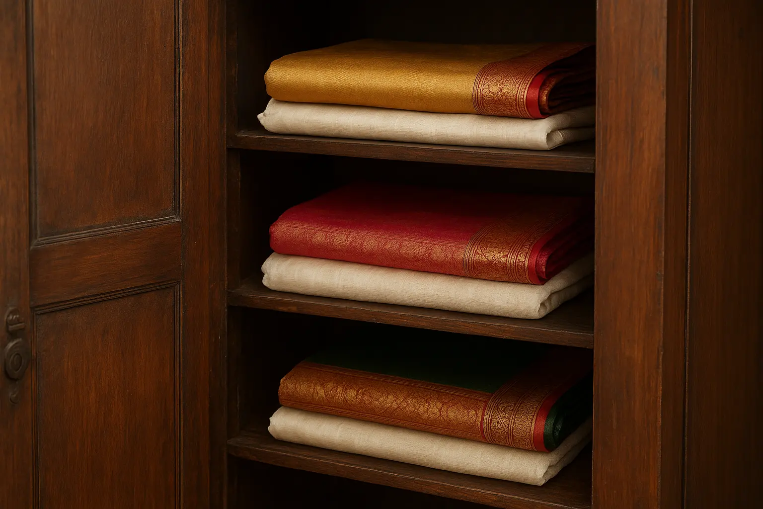 Always fold your silk sarees with the zari facing inward to prevent wear. Store them in muslin or cotton cloth, never in plastic, as silk needs to breathe. Avoid hanging silk sarees for long periods, as it may cause stretching.